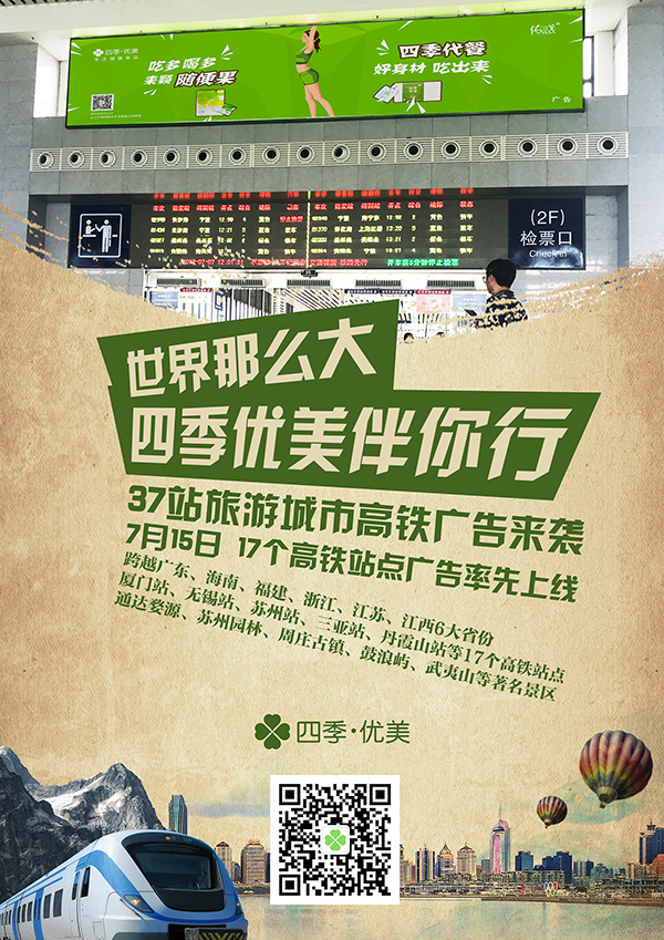 四季優美已多次與高鐵廣告平臺合作。中國進入高鐵時代后,高速鐵路作為一種新的運營方式和媒體資源,在品牌傳播中發揮著巨大的作用。