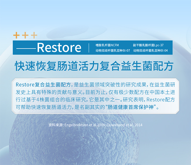 同時,通過試驗發(fā)現(xiàn),Restore復合益生菌配方(由嗜酸乳桿菌NCFM+副干酪乳酪桿菌Lpc-37+動物雙歧桿菌乳亞種Bi-07+動物雙歧桿菌乳亞種Bl-04組成)能幫助改善四聯(lián)治療的副作用,顯著降低抗生素相關性腹瀉(AAD)的發(fā)生率,縮短腹瀉的持續(xù)時間,緩解抗生素藥物導致的腸道不適(如腹痛、腹脹等)。