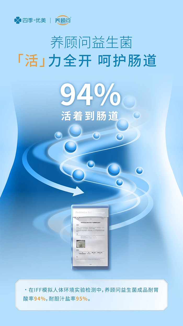 此次獲得權威認證的養顧問益生菌不僅活菌率高,在IFF模擬人體環境實驗檢測中,耐胃酸率高達94%,耐膽汁鹽率高達95%。“高活菌率+高耐胃酸率+高耐膽汁鹽率”,使養顧問“活菌優等生”這一殊榮實至名歸。